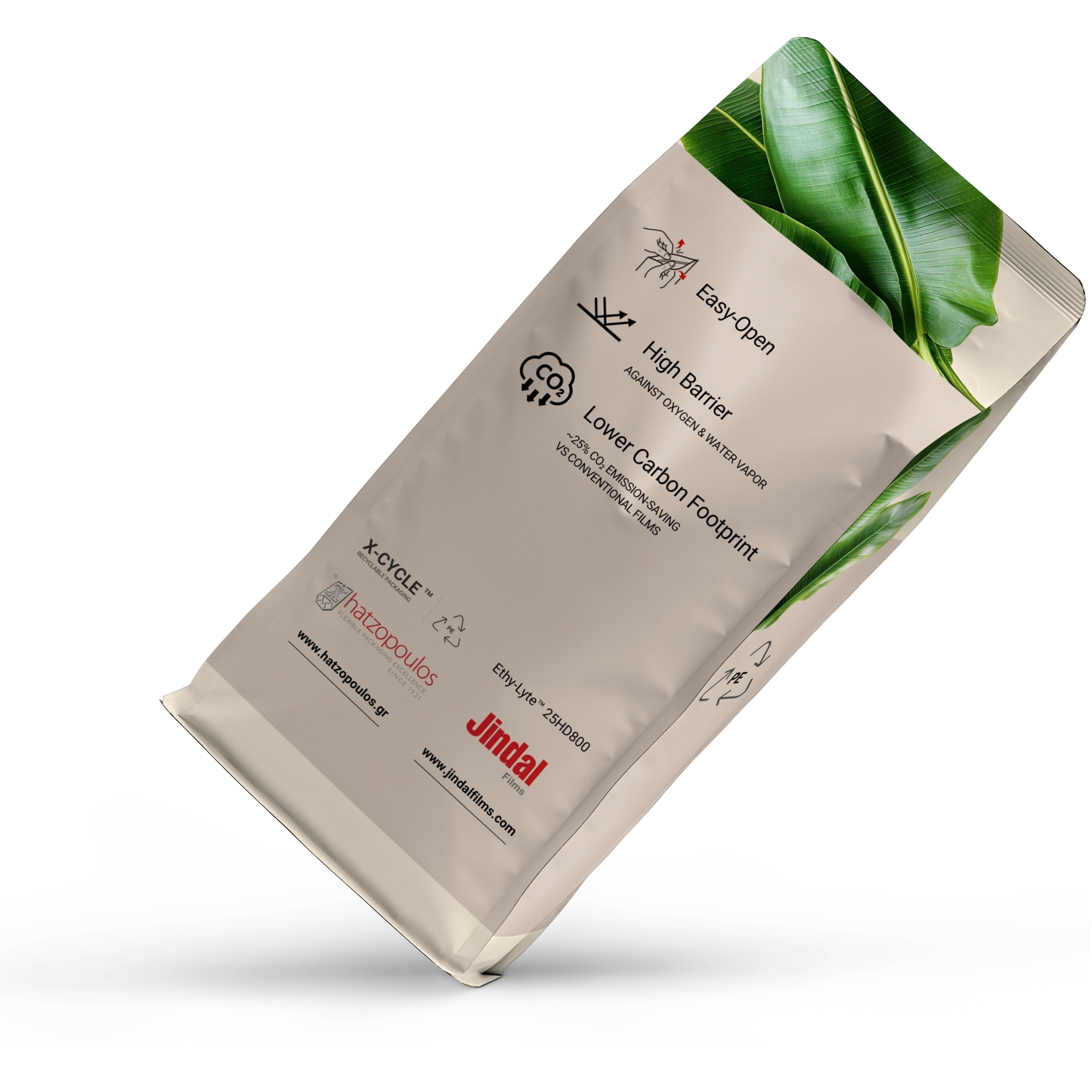 This solution was made possible thanks to Jindal Films’ expertise in high-performance films, and in particular the use of their Ethy-Lyte™ 25HD800 film within the structure. Ethy-Lyte™ 25HD800 is a transparent, high-barrier bi-oriented high-density polyethylene (BOPE) printing film, one side coated with EVOH, offering excellent gas and aroma protection. Designed to serve as an outer printing web for lamination with PE sealing films, it enables the creation of recyclable, 2-ply mono-PE laminates.